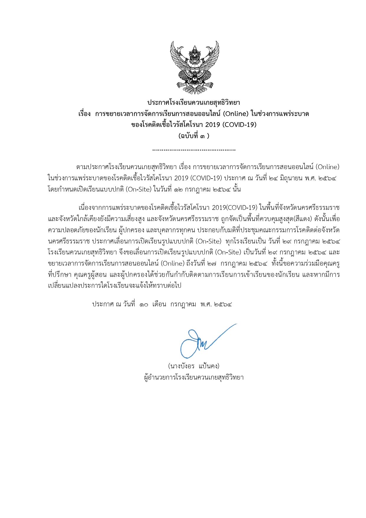 ประกาศโรงเรียนควนเกยสุทธิวิทยา เรื่อง การขยายเวลาการจัดการเรียนการสอนออนไลน์ (Online) ในช่วงการแพร่ระบาด ของโรคติดเชื้อไวรัสโคโรนา 2019 (COVID-19) (ฉบับที่ 3)