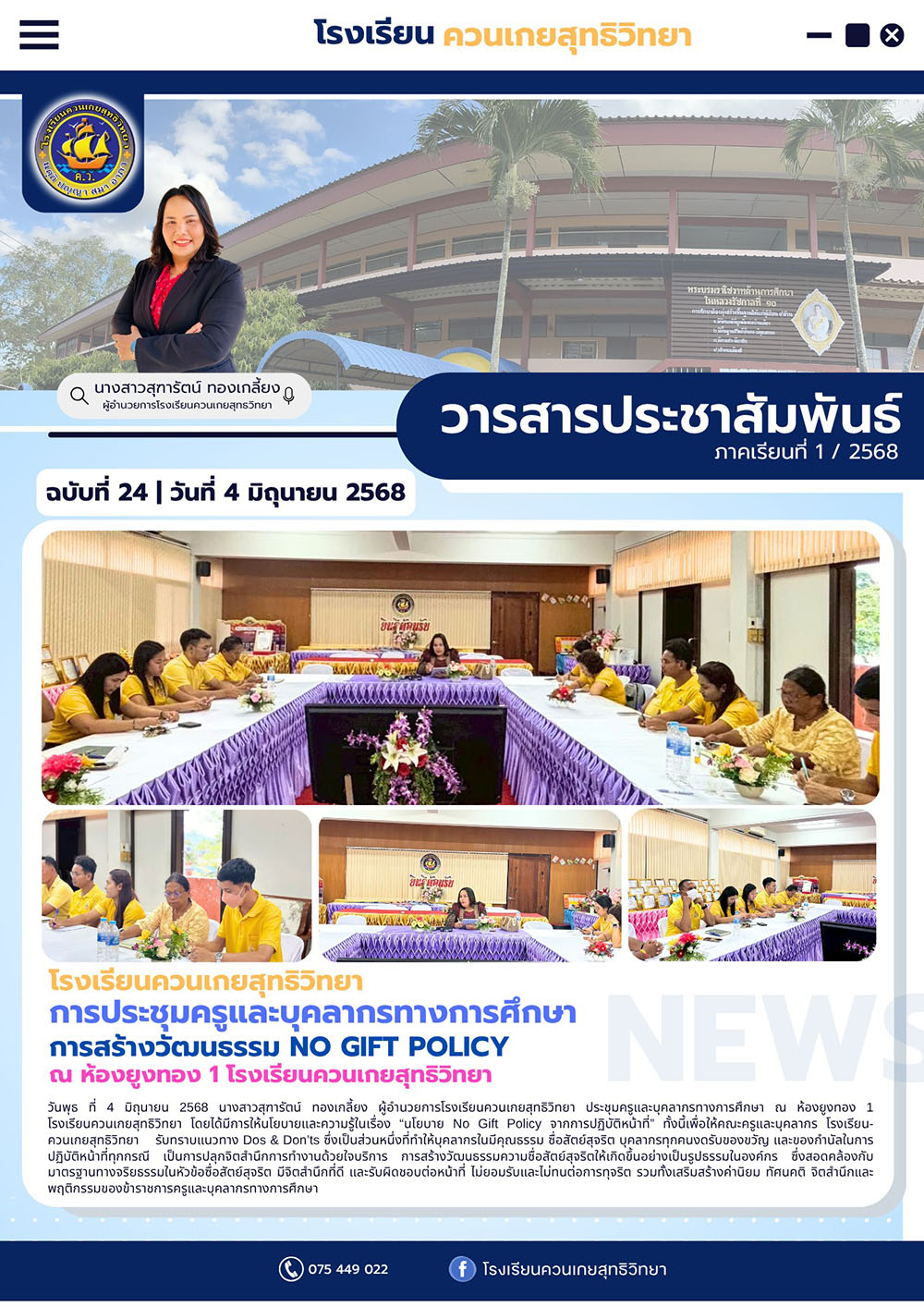 นางสาวสุฑารัตน์ ทองเกลี้ยง ผู้อำนวยการโรงเรียนควนเกยสุทธิวิทยา ประชุมครูและบุคลากรทางการศึกษา ณ ห้องยูงทอง 1 โรงเรียนควนเกยสุทธิวิทยา โดยได้มีการให้นโยบายและความรู้ในเรื่อง “นโยบาย No Gift Policy จากการปฏิบัติหน้าที่” ทั้งนี้เพื่อให้คณะครูและบุคลากร โรงเรียนควนเกยสุทธิวิทยา รับทราบแนวทาง Dos & Don’ts ซึ่งเป็นส่วนหนึ่งที่ทำให้บุคลากรในมีคุณธรรม ซื่อสัตย์สุจริต บุคลากรทุกคนงดรับของขวัญ และของกำนัลในการปฏิบัติหน้าที่ทุกกรณี เป็นการปลุกจิตสำนึกการทำงานด้วยใจบริการ การสร้างวัฒนธรรมความซื่อสัตย์สุจริตให้เกิดขึ้นอย่างเป็นรูปธรรมในองค์กร ซึ่งสอดคล้องกับมาตรฐานทางจริยธรรมในหัวข้อซื่อสัตย์สุจริต มีจิตสำนึกที่ดี และรับผิดชอบต่อหน้าที่ ไม่ยอมรับและไม่ทนต่อการทุจริต รวมทั้งเสริมสร้างค่านิยม ทัศนคติ จิตสำนึกและพฤติกรรมของข้าราชการครูและบุคลากรทางการศึกษา |