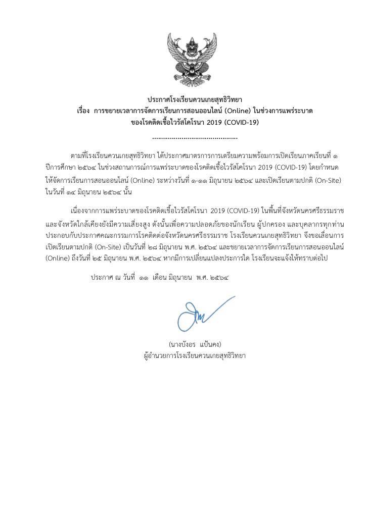 ประกาศโรงเรียนควนเกยสุทธิวิทยา เรื่อง การขยายเวลาการจัดการเรียนการสอนออนไลน์ (Online) ในช่วงการแพร่ระบาดของโรคติดเชื้อไวรัสโคโรนา 2019 (COVID-19)
