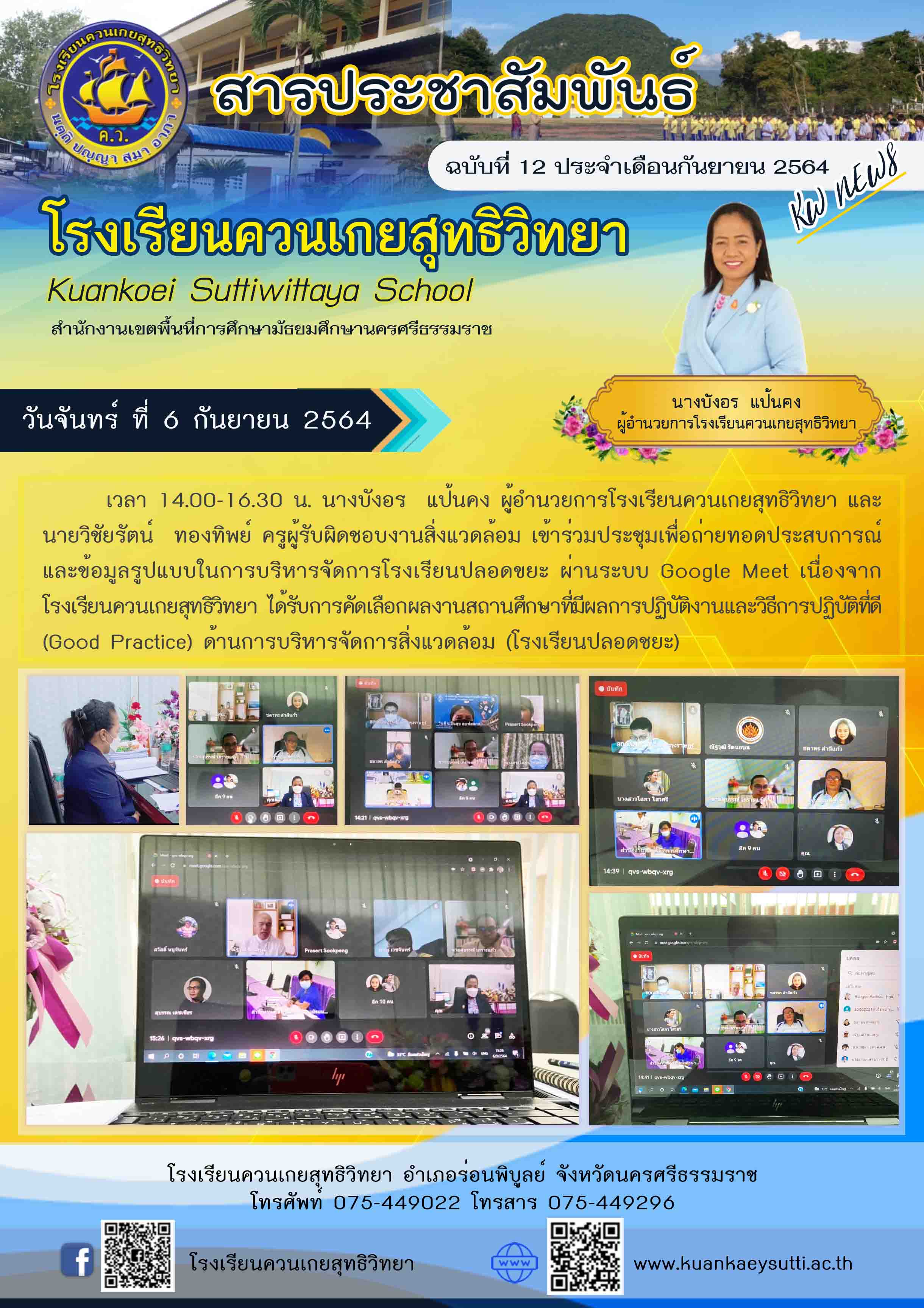 เวลา 14.00-16.30 น. นางบังอร แป้นคง ผู้อำนวยการโรงเรียนควนเกยสุทธิวิทยา และนายวิชัยรัตน์ ทองทิพย์ ครูผู้รับผิดชอบงานสิ่งแวดล้อม เข้าร่วมประชุมเพื่อถ่ายทอดประสบการณ์และข้อมูลรูปแบบในการบริหารจัดการโรงเรียนปลอดขยะ ผ่านระบบ Google Meet เนื่องจากโรงเรียนควนเกยสุทธิวิทยา ได้รับการคัดเลือกผลงานสถานศึกษาที่มีผลการปฏิบัติงานและวิธีการปฏิบัติที่ดี