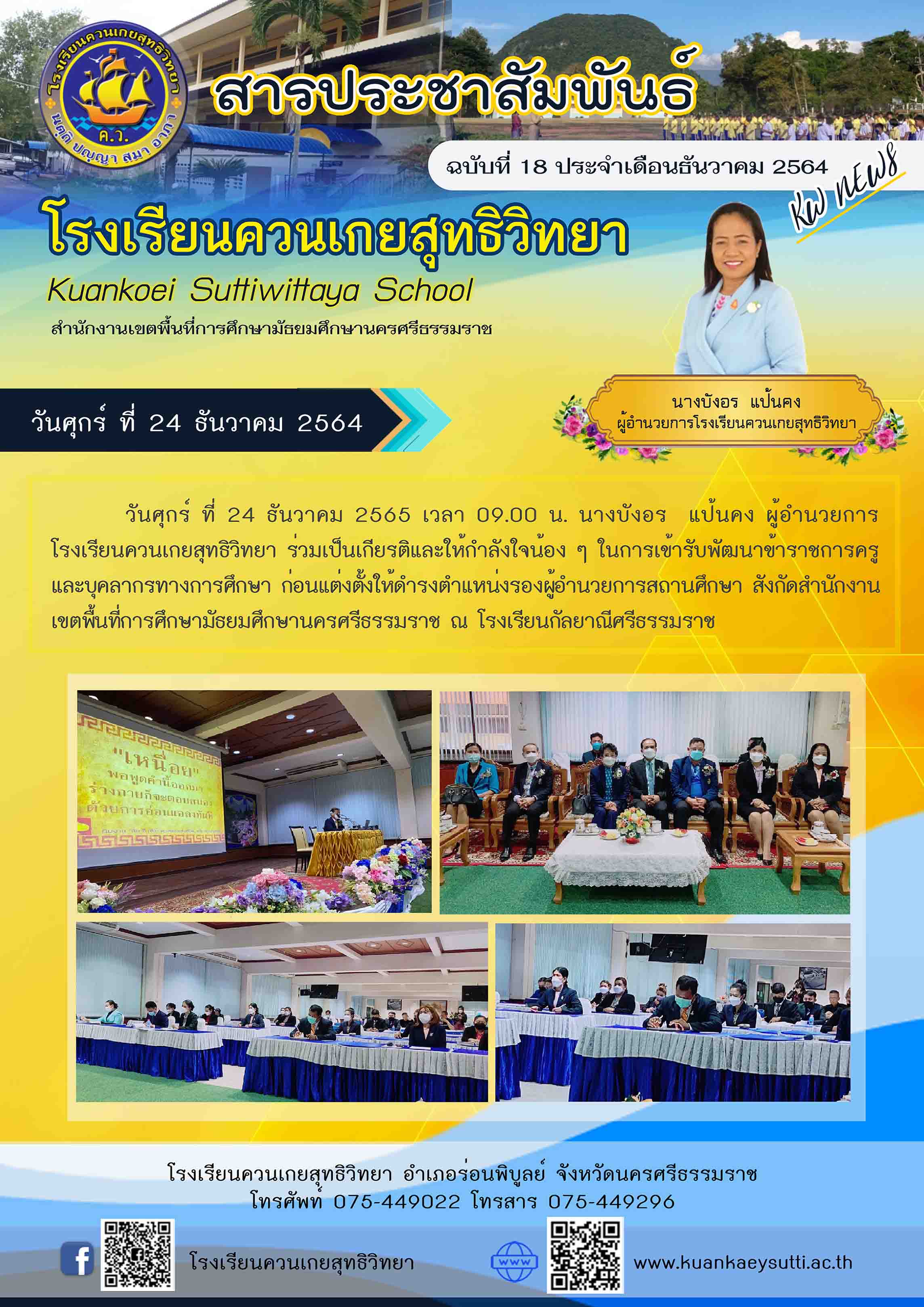 เวลา 09.00 น. นางบังอร แป้นคง ผู้อำนวยการโรงเรียนควนเกยสุทธิวิทยา ร่วมเป็นเกียรติและให้กำลังใจน้อง ๆ ในการเข้ารับพัฒนาข้าราชการครูและบุคลากรทางการศึกษา ก่อนแต่งตั้งให้ดำรงตำแหน่งรองผู้อำนวยการสถานศึกษา สังกัดสำนักงานเขตพื้นที่การศึกษามัธยมศึกษานครศรีธรรมราช ณ โรงเรียนกัลยาณีศรีธรรมราช