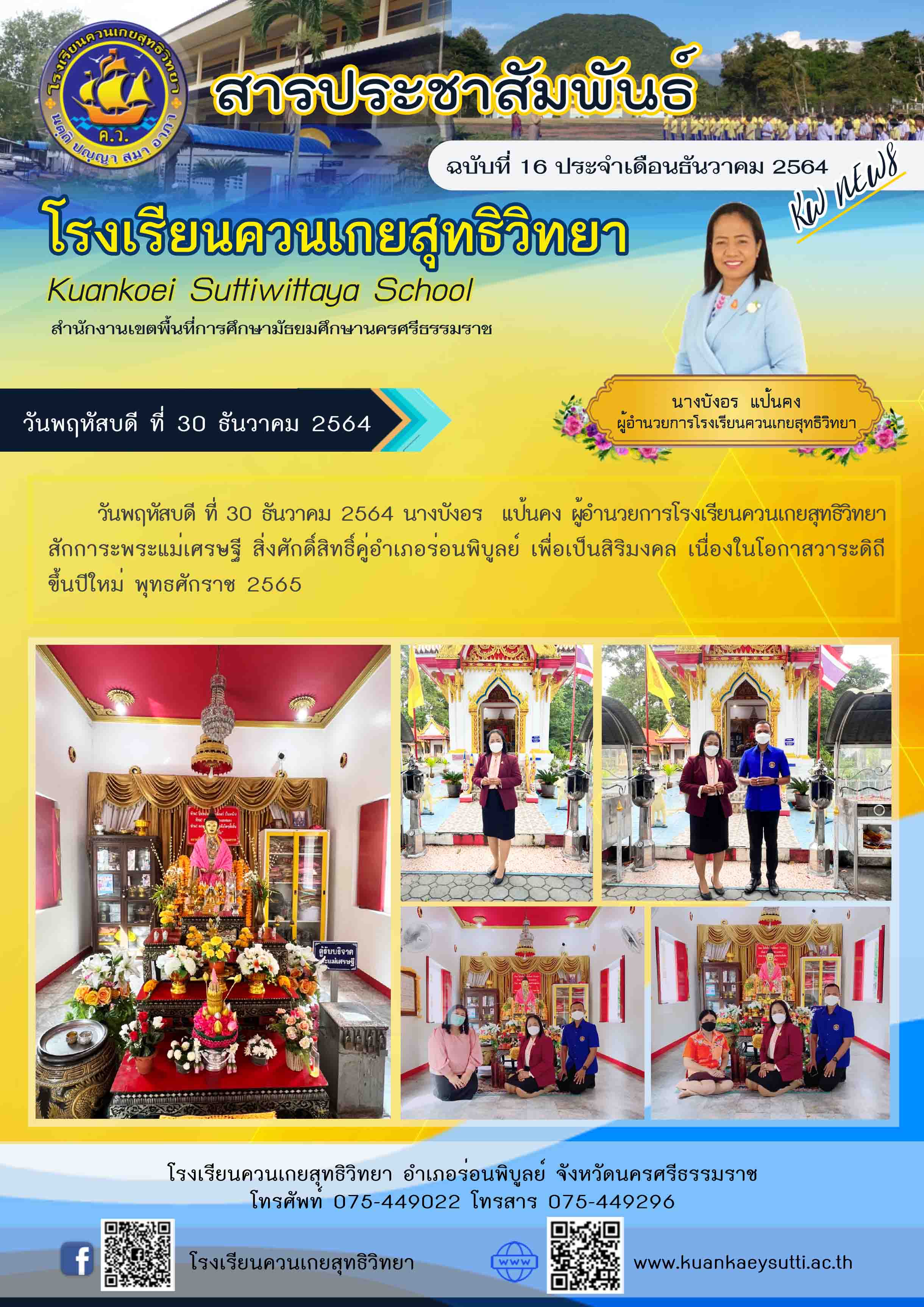 นางบังอร แป้นคง ผู้อำนวยการโรงเรียนควนเกยสุทธิวิทยา สักการะพระแม่เศรษฐี สิ่งศักดิ์สิทธิ์คู่อำเภอร่อนพิบูลย์ เพื่อเป็นสิริมงคล เนื่องในโอกาสวาระดิถีขึ้นปีใหม่ พุทธศักราช 2565